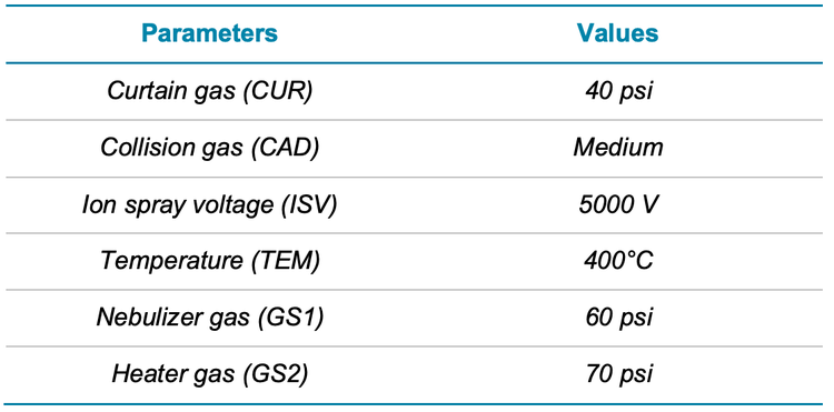 Mass spectrometry. The QTRAP 4500 system was operated in multiple reaction monitoring (MRM) mode with electrospray ionization in positive ion mode. Two selected MRM transitions were monitored for analyte quantitation and confirmation based on the ion ratio. Optimized source and compound-specific parameters are presented in Tables 2 and 3, respectively.
