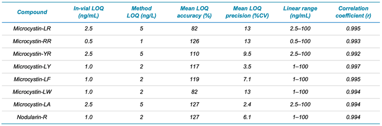 Performance of the QTRAP 4500 system for microcystin and nodularin-R analysis was investigated through triplicate injections of the solvent-based calibration standards. LOQs ranged from 0.5 to 2.5 ng/mL (Table 4), demonstrating good sensitivity of the QTRAP 4500 system. The equivalent method in-sample LOQs ranged from 1 to 5 ng/L and were back-calculated from the in-vial LOQ values based on the 500x SPE concentration factor. Selection of the LOQ was based on the concentration level achieving average accuracy ±30%, precision %CV <15% for the quantifier ion, ion ratio tolerance ±30%, signal-to-noise ratio (S/N) >10 and r value >0.99.
