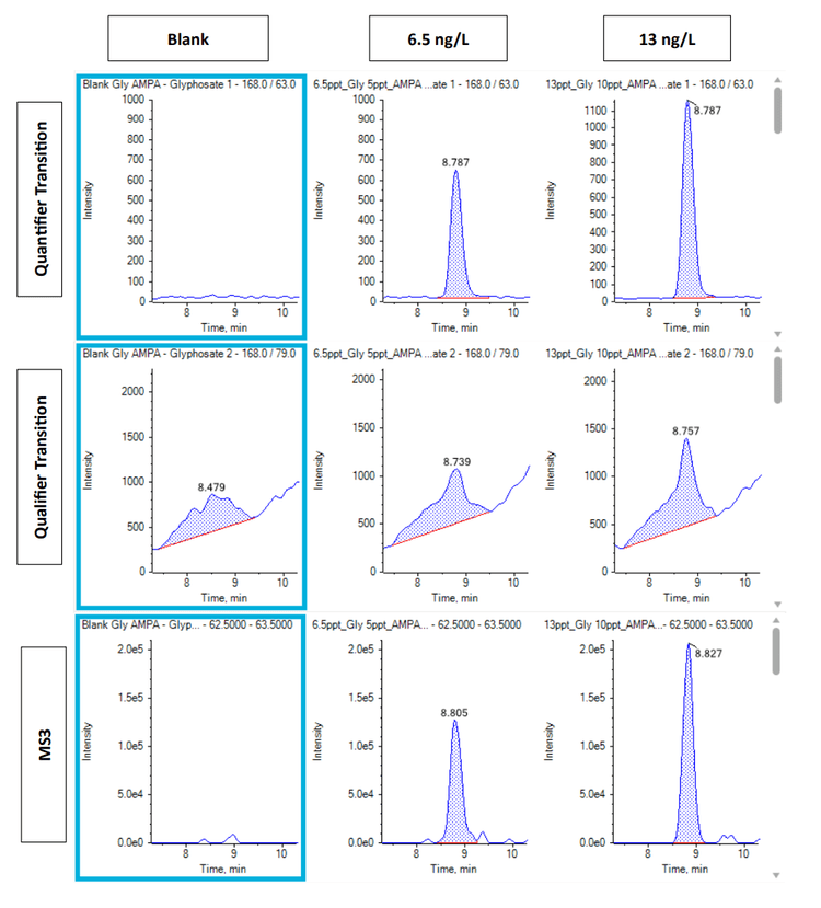 This example shows the importance of being able to perform an MS3 scan with your instrument. For glyphosate, the typical second transition provides a high background and lacks sensitivity. An MS3 transition improves the sensitivity due to increased selectivity. Figure 7 compares the second MRM transition for glyphosate and the MS3 transition using either QTRAP 6500+ or the SCIEX 7500 system.