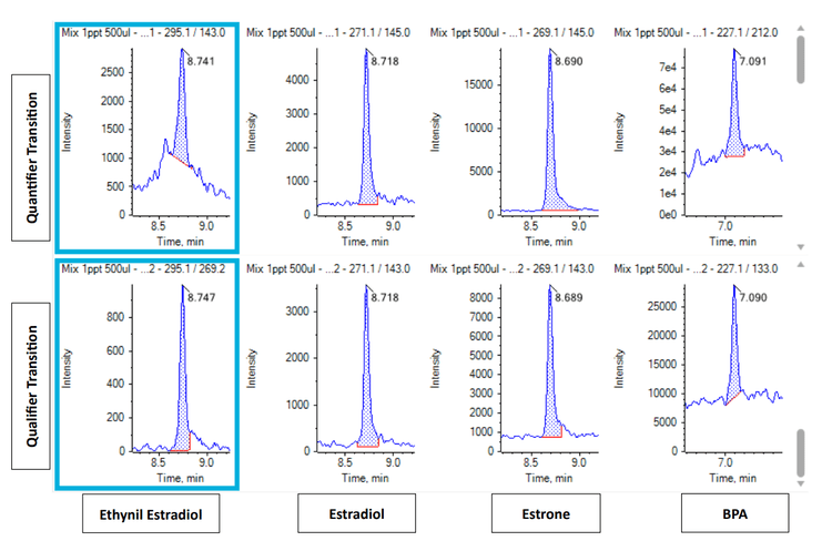 The sensitivity of the SCIEX 7500 system is demonstrated in Figure 1, with 1 ng/L XICs shown for 4 of the compounds analyzed, meeting the EU watch list recommendation when using a large-volume injection. This method also combines hormones, BPA and nonylphenol in a single analysis, without the need for SPE pre-concentration of samples.