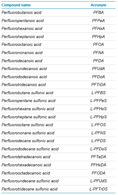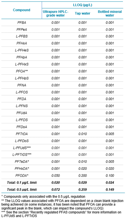 • LLOQ values down to 0.001 µg/L for the majority of the analyzed PFAS compounds