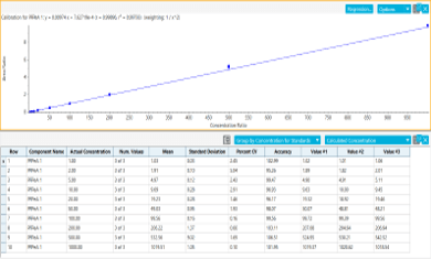 Figure 4c. Calibration curves of PFNA in HPLC grade water. Calibration curve spanning the range of 0.001–1 µg/L with accuracy values at each level between 80% and 120%, and %CV (%RSD) values below 10%.