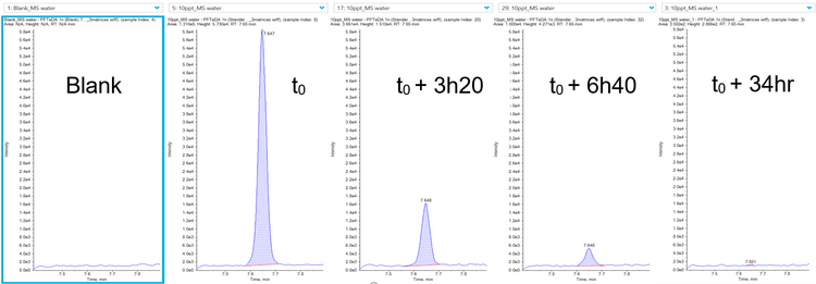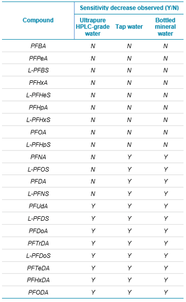 Table 2. Effect of glass vials on PFAS stability. The compounds here were found to be susceptible to a sensitivity decrease over 34 hours when using glass vials. The decrease is more pronounced for longer-chain PFAS compounds and is unaffected by the water analyzed. This demonstrates the importance of using polypropylene vials to ameliorate this effect.