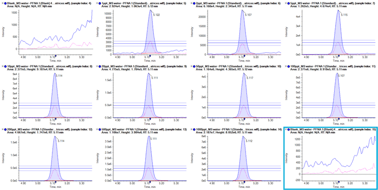 Due to the lowered limits associated with PFAS analysis, it has become increasingly important to provide higher levels of sensitivity to the environmental industry to ensure that the relevant LLOQs can be achieved with accuracy, precision and robustness. Good chromatography is key to providing good separation and removing any instrument contamination from the analysis (Figure 2). To characterize the sensitivity of the QTRAP 6500+ System, concentration curves were generated in HPLC grade water. Example chromatograms for PFNA across the 10-point PFNA calibration curve highlights the quality of the data (Figure 3).