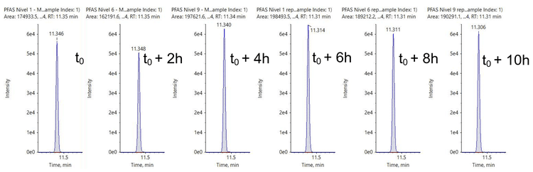 Figure 7. Stability assessment of MPFDoA in polypropylene vials over time. XICs of MPFDoA (an internal standard of PFDoA) over a 10-hour period when using polypropylene vials. The sensitivity of PFDoA was shown to decrease over time in glass vials (Table 2). This highlights the stability of the peak area and height when using polypropylene vial material. The above XICs show the internal standard measured from standard solutions and drinking water samples from across the analysis, showing its consistency over time even in different solutions and matrices.