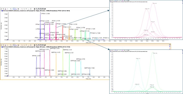 Figure 2. Good separation of all PFAS compounds. Overlaid XICs of all PFAS compounds analyzed (top) and the corresponding internal standards (bottom) at a concentration of 0.02 µg/L. Both zoomed-in panes show that even though some of the compounds could not be fully resolved chromatographically, the use of specific MRM transitions for each compound means that these compounds can be resolved using the mass spectrometer.