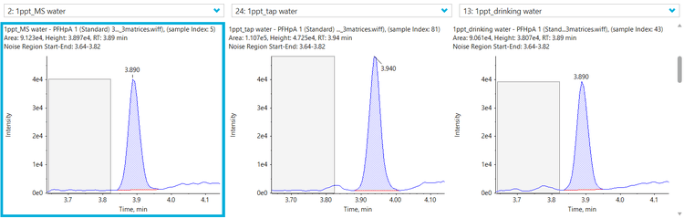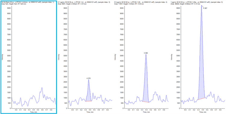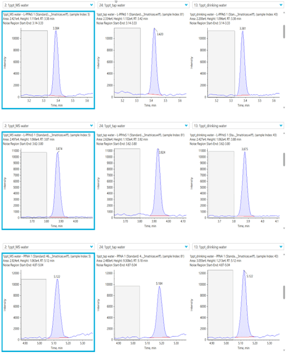See Figure 1 for example XICs from a PFAS compound at it’s LLOQ in 3 different water matrices.