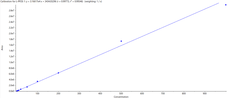 Figure 9. Calibration curve of L-PFOS on the SCIEX 7500 System. Calibration curve for data depicted in Figure 8 showing the linearity of the data from 0.0001–1 µg/L, highlighting both the sensitivity of the system and the linear dynamic range that has been achieved (r = > 0.99).