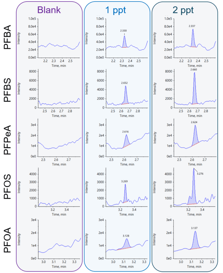 Regular maintenance and replacement of HPLC components with PFAS-free alternatives are crucial to mitigate the risk of contamination in the analytical process. To assess potential PFAS presence, background blank samples were run and compared to low concentration analytical standards. Most standards were spiked at 1 ppt, except for N-MeFOSAA and N-EtFOSAA, which were spiked at 2 ppt. The results indicated that for all analytes, background levels were <1/3 of the lowest concentration standard used in the curve,2 demonstrating the ability of the ExionLC AE system to reach the low-level concentrations required of regulated PFAS methods (Figure 3).