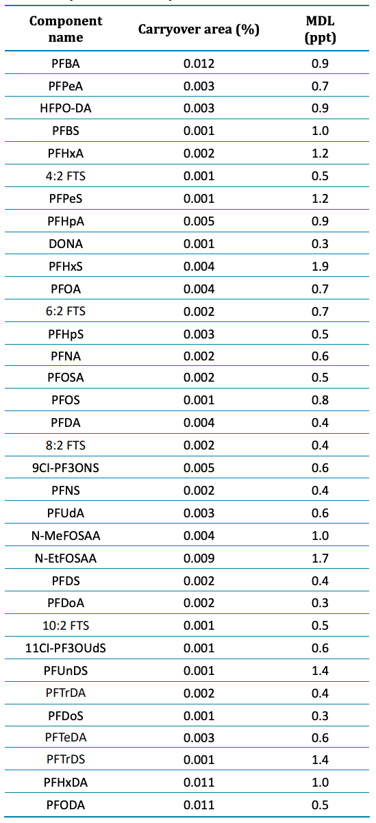 Blank samples exhibited minimal responses, falling below the required threshold of <1/3 of the method detection limit (MDL).2 Figure 2 shows representative carryover peaks for selected PFAS compounds. The blank injections shown were performed immediately following the injection of the highest calibration standard at 5000 ppt. The calculated concentrations of the first blank after the highest concentration sample (5000 ppt) were all <0.33 ppt and <1/3 of the MDL for all compounds, as shown in Table 3. Importantly, the area of all carryover peaks was <0.012% of the highest standard peak area (5000 ppt).