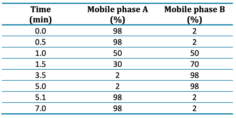 Chromatography: Sample separation was achieved using the ExionLC AE system and a Phenomenex Luna™ Omega PS C18 (3 µm, 100 x 2.1 mm, P/N: 00D-4758-AN) column. A Phenomenex Luna Omega PS C18 (5 µm, 50 x 3 mm, P/N: 00B-4753-Y0) column was installed after the mixer and utilized as a delay column to separate PFAS contamination in the mobile phases from the analytical peaks for each compound. A 7-minute gradient of water and methanol with 10mM ammonium acetate buffer was used with a flow rate of 0.8 mL/min, column temperature of 40°C and a 10 µL injection volume (Table 1). Methanol was used as a needle wash solvent.