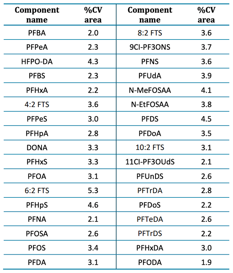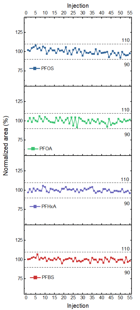Additionally, the area of each analyte was tracked across all 55 injections (Figure 4). The area for all monitored analytes showed variation within ±10%. The average CV was 3.1% and 6:2 fluorotelomer sulfonate (6:2 FTS), a contaminant commonly observed in laboratory materials and equipment, exhibited the highest variability with a CV of 5.3% (Table 4). The CVs observed for all other compounds were <5%.