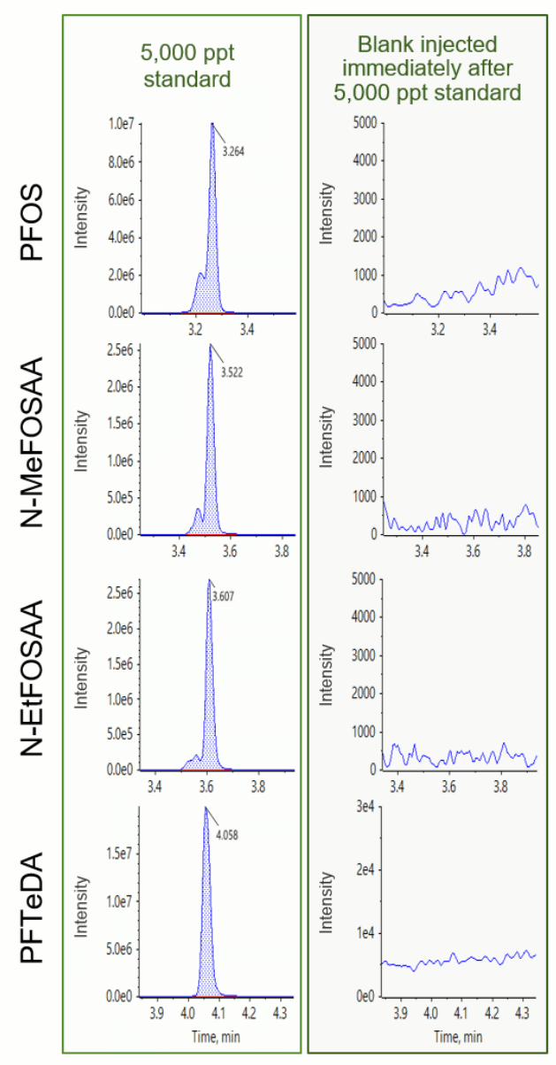 - Blank samples that were run after the highest calibration standard injection showed minimal carryover and were <0.012% of the highest standard peak area (5000 ppt)