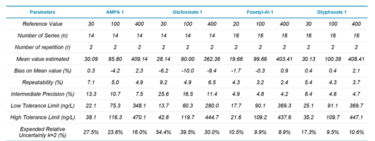 The accreditation results are summarized both in Table 3, which displays the detailed statistics for the four compounds and in Figure 1, which depicts the corresponding trueness profiles of the four compounds. With most of the observed biases below 2%, the estimated mean values are very close to the reference values and show very good accuracy of the method in all water types. The intermediate precision is also very satisfying with values below 15%, except for glufosinate, which can show higher values. Although in agreement with the accreditation specifications, the results for glufosinate are not as good as the other 3 compounds as illustrated in Figure 1. This behavior could be explained by the use of AMPA-IS to correct peak areas, and therefore should be improved by the use of an isotopically labelled glufosinate standard instead.