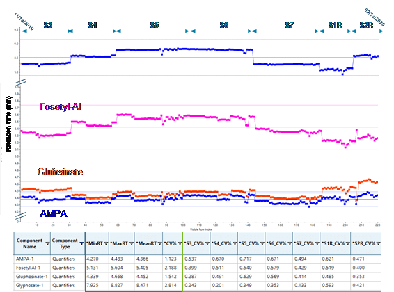 Figure 6 displays the retention times and statistics observed for calibration levels, QC, spiked matrix samples and routine samples where a peak could be quantified for sequences S3, S4, S5, S6, S7, S1R and S2R. Retention times are extremely stable since the maximum CV observed is 0.7 % within a sequence (S5, AMPA) and 2.8% across all sequences (glyphosate) with a total of 225 samples considered.