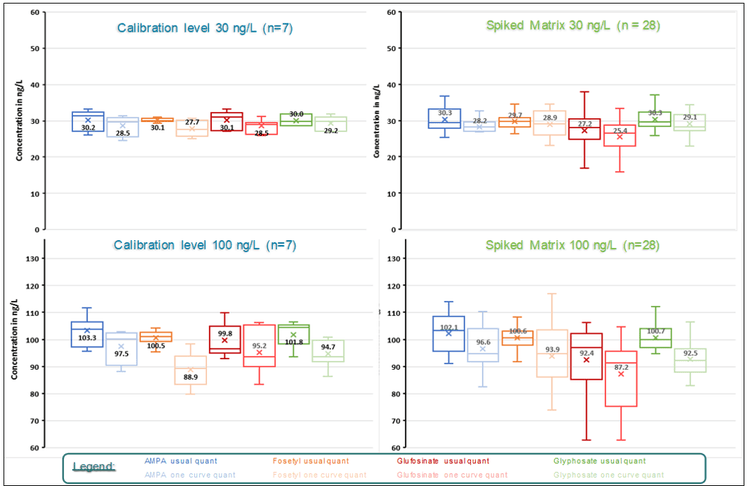 Figure 7 shows that the two strategies give very satisfying results both in accuracy and reproducibility. This demonstrates that using only one calibration curve to quantify samples from multiple sequences acquired over one or several months is perfectly conceivable. However, although the results are very good for glyphosate and AMPA, there is room for improvement regarding glufosinate and fosetyl-Al. Indeed, as already mentioned for glufosinate, the use of a dedicated internal standard should improve its overall results. Regarding Fosetyl-Al, one can note that the boxplots widened, and the mean concentration decreased when using the single calibration curve strategy. This behavior could be explained by a stability issue of the fosetyl-Al stock solution that was observed during the tests.