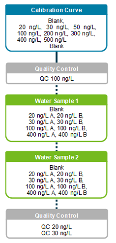 As displayed in Figure 2, the 8 sequences were built in a similar way and all contained: a calibration curve from 20 to 500 ng/L in pure water, followed by a blank injection to verify that there is no carryover, a quality control at 100 ng/L, two water samples with a blank and four spiking levels (20, 30 ,100 and 400 ng/L) in duplicate, and finally QCs at LOQ values of 20 and 30 ng/L. Depending on the sequence, other injections corresponding to stability studies or other tests needed for the laboratory were inserted between the different injection units. Using this procedure, the performance of the modified NofaLab / SCIEX method was evaluated on 16 different water samples representing 8 chlorinated waters, 6 surface waters and 2 underground waters, spiked in duplicates at 20, 30, 100 and 400 ng/L.