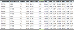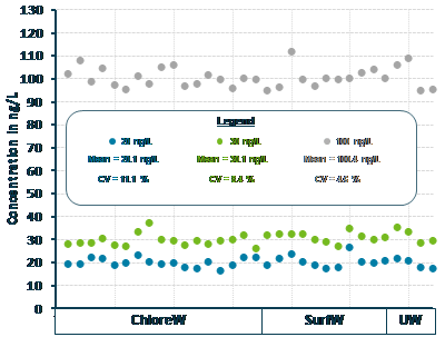 The trueness study is designed to assess the intermediate precision and the bias of the measurement by comparison against reference values. For this purpose, 16 water samples were spiked at 20 and 30 ng/L (LOQ levels), 100 ng/L (20% of the linearity range) and 400 ng/L (80% of the linearity range).3 To test repeatability and intra-lab reproducibility, duplicates were with various conditions (i.e. operators, calibration, equipment, environment, time between measurement) and injected within the 8 analytical sequences in November and December 2019.