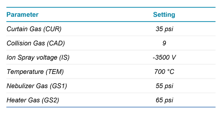 Mass spectrometry: The SCIEX QTRAP 6500+ System was employed for its sensitivity and robustness. Optimized MRM transitions, detailed in Table 1, were selected and utilized for maximum sensitivity. Isotopically labelled target analytes (AMPA 13C15N, glyphosate 1,2-13C2 15N, fosetyl-aluminium D15) were utilized as internal standards for achieving the highest quality quantification. Note that AMPA 13C15ND2 was also used for the correction of glufosinate results. Details of ion source parameters can be found in Table 2.