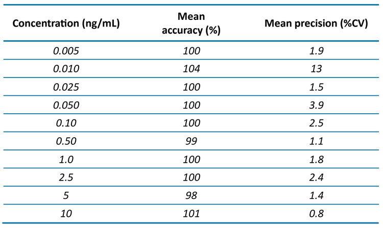 Calibration standards were injected in triplicate to evaluate the sensitivity, accuracy, precision and linear dynamic range of 6PPD-Q using the QTRAP 4500 system. The in-vial LOQ was 0.005 ng/mL (Figure 2) with a mean accuracy of 99.6% and a mean precision of 1.9% CV (Table 4). The r2 was 0.999 over the linear range of 0.005–10 ng/mL. The LOQ was chosen based on the 2 MRM transitions, which both achieved a signal-to-noise (S/N) ratio of ≥10, accuracy ±10%, precision <10% and ion ratio tolerance of ±30%. Considering the entire calibration range, the mean accuracy was within 4% and the mean precision was <3.9% CV, except for the 0.01 ng/mL level (Table 4).