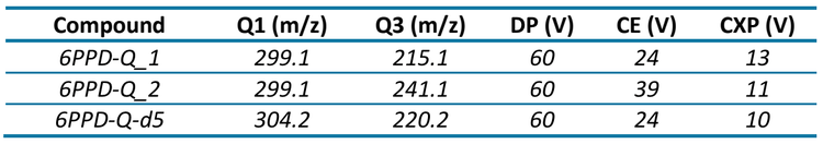 - The development of a high-throughput, direct injection method to analyze 6PPD-Q in environmental water samples with an 8.5 min runtime