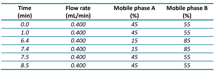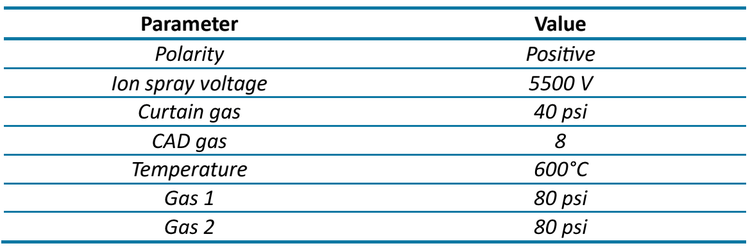 Chromatography: An ExionLC AD system was used with the Phenomenex Kinetex™ C18 column for chromatographic separation (2.6 μm, 100 mm x 2.1 mm, P/N: 00D-4462-AN). Mobile phase A was 0.1% formic acid in water and mobile phase B was acetonitrile. The flow rate was 0.400 mL/min and the gradient conditions used are shown in Table 1. The injection volume was 20 μL and the column oven temperature was 40°C. The autosampler temperature was set to 10°C and 1 mL of rinsing solution (50:50 acetonitrile/water, v/v) was used for the needle washing.