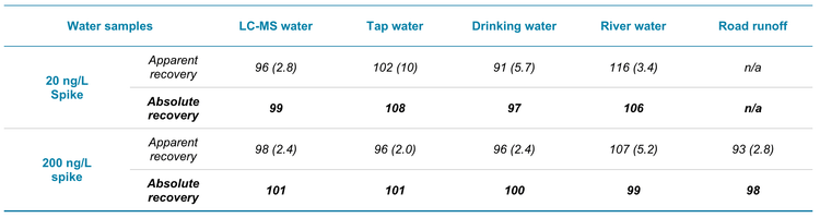Matrix spike recovery experiments: Method recovery was determined by performing matrix spikes (n=3) before sample preparation (pre-spike) and, in separate samples, after sample preparation (post-spike). The absolute recovery was calculated as the ratio of the pre-and post-spike area counts without ISD normalization. The apparent recovery was calculated after ISD normalization. The method recovery and the matrix effects were evaluated at 2 spiking levels, 20 and 200 ng/L.