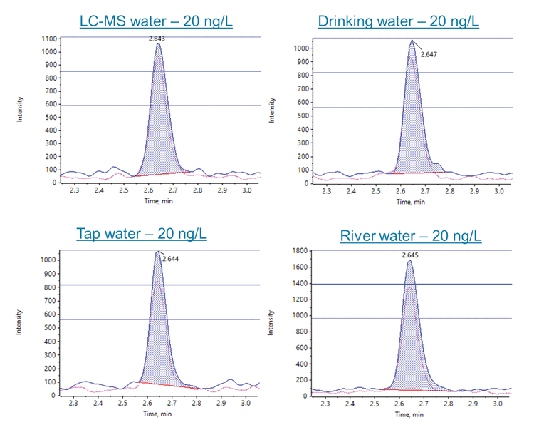 - Mid-range ng/L sensitivity in water matrices: Good sensitivity was observed for 20 ng/L spikes in various water samples