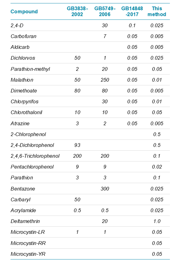 - This method covers the 20 compounds in the Chinese national standards GB 3838-2002, GB 5749-2006, and GB 14848-2017 and two additional microcystin compounds of concern