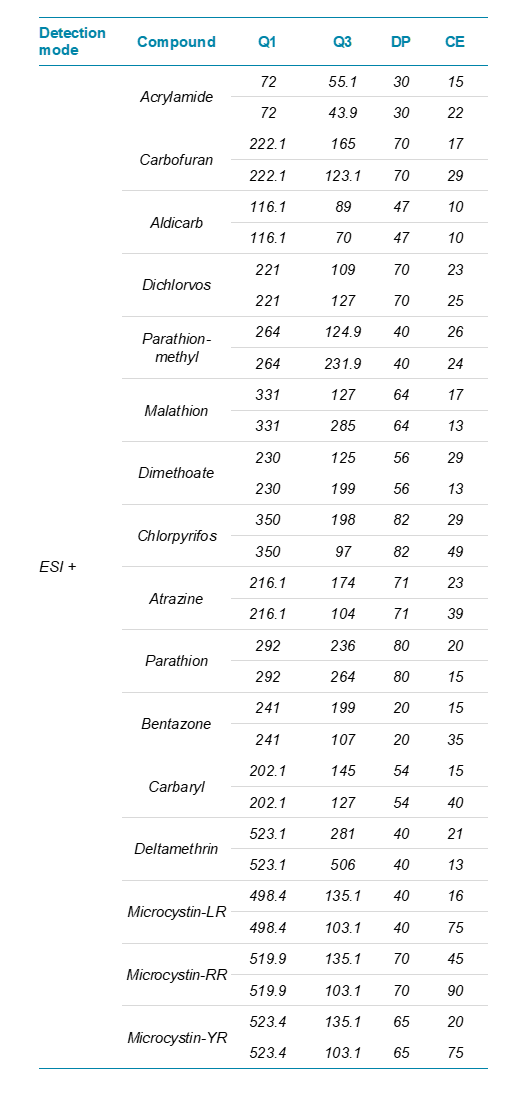 A workflow comprising LC-MS/MS methods on the SCIEX Triple Quad 3500 System was developed which can completely cover the current Chinese national standards for surface water environmental quality standards (GB3838-2002), national drinking water standards (GB5749-2006) and groundwater quality standards (GB14848-2017). The lower limit of the method was better than the current standard, providing an accurate quantitative LC-MS/MS detection method.