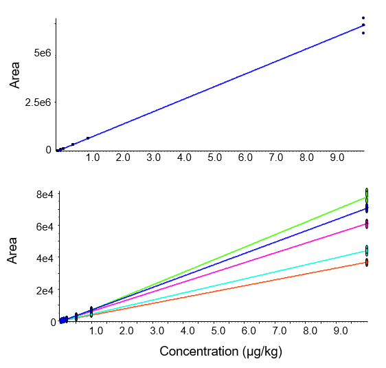 Calibration curves were generated for all 22 compounds in the method. Results are summarized in Table 5 and compared to the requirements for the Chinese national standards. The lower limits of quantification achieved with this method meet or surpass the current requirements.