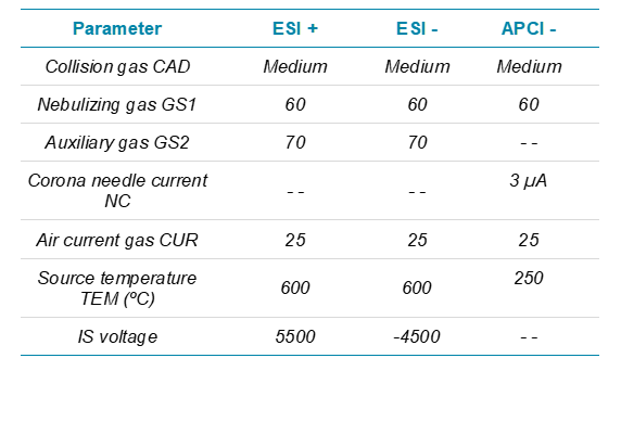 Mass spectrometry: Samples were analyzed using the SCIEX Triple Quad 3500 LC-MS/MS System. The method was divided into ESI positive, ESI negative and APCI negative ion modes of detection. Method parameters are described in Tables 2 - 4.