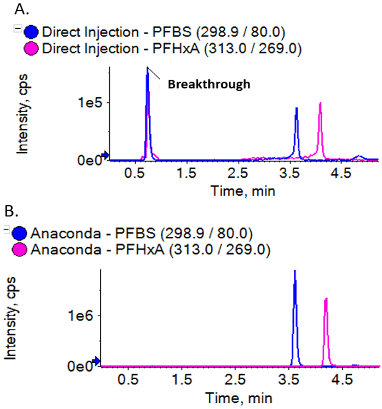 Typically, the high injection solvent strength required by EPA Method 537 causes excessive breakthrough and peak splitting, even with a 1 µL injection volume (Figure 2a). To prevent this from occurring, online mixing was promoted using an AnaCondA with a wide internal diameter (ID) of 0.5 mm and length of 5 cm after the sample loop as shown in Figure 1. In addition to the AnaCondA, a faster sample injection speed was performed to increase the mixing turbulence. This allowed the injection volume to range between 1 – 10 µL without breakthrough or peak splitting (Figure 2b). The data shown in this application note was generated using a 4 µL injection volume, to represent a traditionally monitored concentration range.