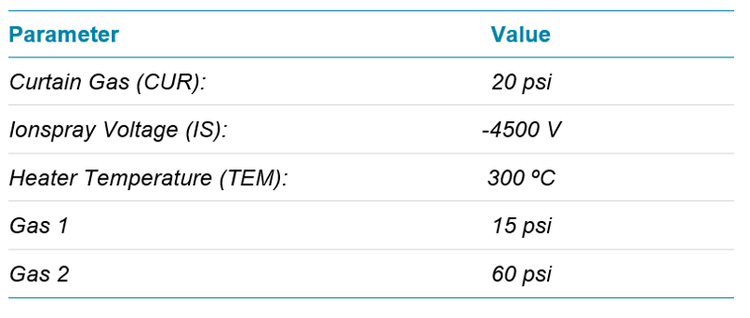 All analytes were monitored in multiple reaction monitoring (MRM) scan mode in negative polarity. The Scheduled MRM™ Algorithm was used to monitor compounds during a 60 second expected retention time window to maximize dwell times and optimize the cycle time of the method.