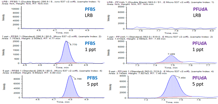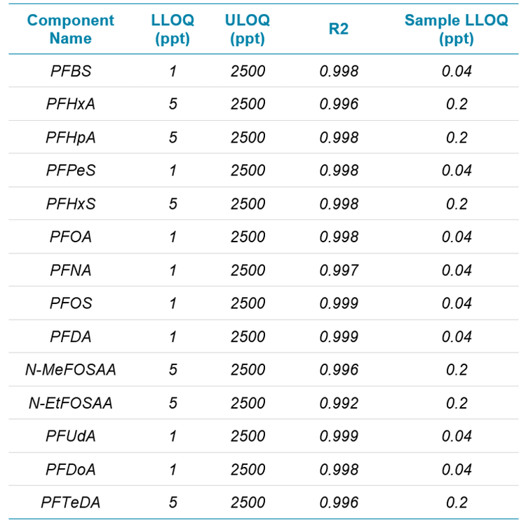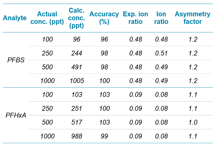 In EPA Method 537, peak asymmetry must fall in the range of 0.8 to 1.5 for the first two eluting compounds (PFBS and PFHxA). Using the outlined method, PFBS and PFHxA met all asymmetry requirements with values ranging from 1.0 to 1.2 (Table 3) at all the quality control concentration levels. Additionally, the ion ratios for both PFBS and PFHxA were within ±20% and the calculated concentration was within 5% of the expected value.