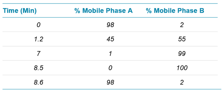 Chromatography: The microflow analysis was performed using an M5 MicroLC System at a flowrate of 10 µL/min. A Gemini C18 3 µm, 100 x 0.3 mm column (Phenomenex) was used. This column uses the identical stationary phase, but smaller internal diameter as the high flow method.5 Mobile phases A and B were Milli-Q water with 10 mM ammonium acetate and J.T.Baker Ultra LC-MS grade methanol with 10 mM ammonium acetate, respectively (Table 1).