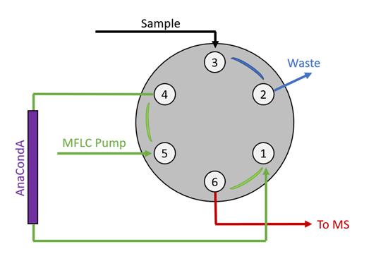 A sensitive and robust method was developed for microflow analysis of the analytes in EPA Method 537. The assay showed reproducibility of internal standards, surrogates, and calculated concentrations of unknown environmental samples over multiple days. The increase in sensitivity in this study enabled LLOQs of 1-5 ppt for EPA Method 537 with a 4 µL injection volume. A larger injection volume, enabled by the AnaCondA mixing approach, would allow for even lower LLOQs if necessary.