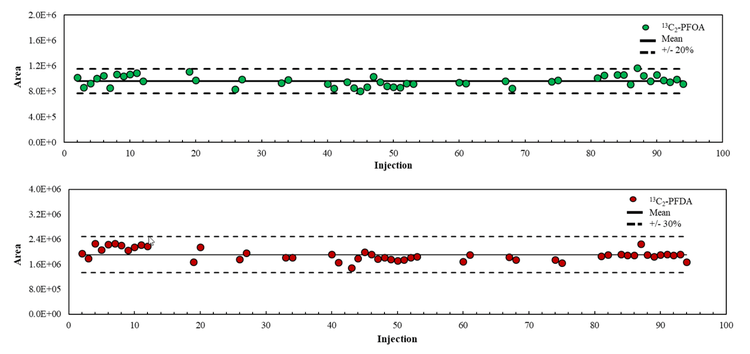 The normalized area of the ISTDs was compared for all extracted samples (Figure 4). The median normalized area for 13C2-PFOA was 98%, with the lowest response at 71% and the highest at 125%. All values were within ±30%, suggesting no major ion suppression or enhancement is occurring. The median normalized surrogate area for 13C2-PFDA was 101%, with the lowest value of 82% and the highest of 120%, thus indicating acceptable recovery during extraction the recovery of this compound during the extraction process is acceptable.