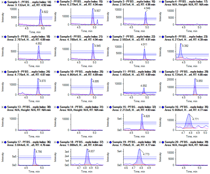 Sample preparation: Sample preparation and data processing were carried out according to EPA Method 537. An additional 1/10 dilution was then performed. A total of 20 samples were extracted out of a variety of matrices, including drinking water, groundwater, wastewater, and soil extracts. The internal standards (ISTD) used were 13C2-PFOA, 13C4-PFOS, and d3-NMeFOSAA. The surrogates used were 13C2-PFHxA, d5-NEtFOSAA, and 13C2-PFDA. The complete sample set, including calibration and quality control samples, was run on 3 separate days.