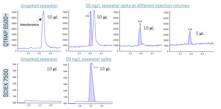 - Leveraging sensitivity of the QTRAP 6500+ and SCIEX 7500 systems for lower injection volumes to overcome matrix effects in seawater and potentially other complex aqueous matrices.