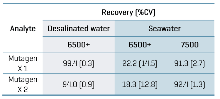 The quantitative performance of the direct LC-MS/MS injection method was evaluated in desalinated water and seawater samples spiked at 50 ng/L, in triplicate. Excellent mean recovery (99%, %CV 0.3%, n = 3) was achieved in desalinated water at an injection volume of 50 µL on the QTRAP 6500+ system (Table 4), while the recovery (22.2%) in seawater was initially impacted by coeluting interferences at the same injection volume. Upon lowering the injection volumes to 10 µL and 5 µL, seawater recoveries improved to 72% and 79% , respectively, on the QTRAP 6500+ system. Recovery further improved to 91.3% (%CV 2.7%, n = 2) when the seawater s pike was injected at 10 µL on the SCIEX 7500 system.