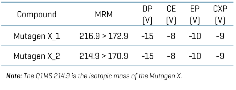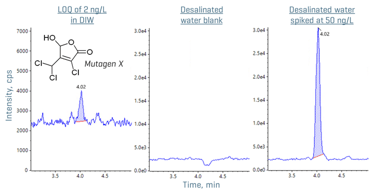 A simple direct LC-MS/MS injection method was developed for the quantitation of Mutagen X in desalinated water and seawater using the QTRAP 6500 + system, featuring: