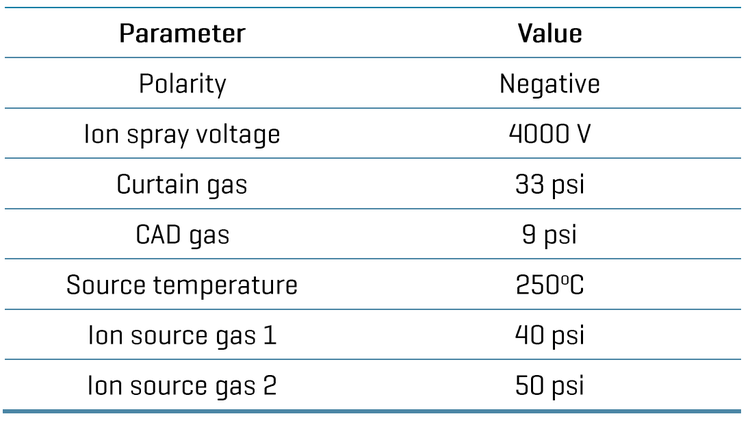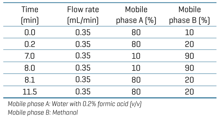 Chromatography: Chromatographic separation was performed on an Agilent Infinity 2 LC system using a Phenomenex Synergi Polar-RP column (100 x 2 mm, 2.5 µm, P/N: 00D- 4371-B0). A flow rate of 0.35 mL/min, a column oven temperature of 40°C and an injection volume of 50 µL were used. Table 1 shows the chromatographic gradient.