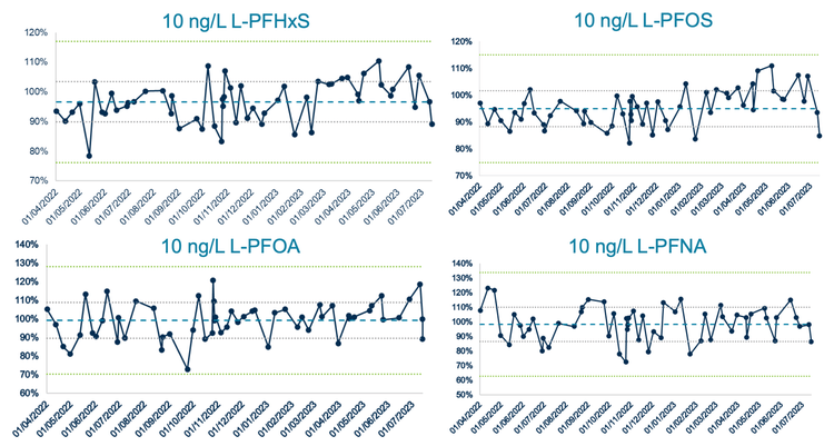 Figure 1. Percent accuracy plots of 4 regulated PFAS compounds at multiple timepoints. The plots highlight the robustness observed. The grey dotted lines show ±1 standard deviation and the green dotted lines show ±3 standard deviations. During this period, no value fell outside of ±30% of the mean. The QC samples were spiked into matrix and were representative of multiple different water samples.