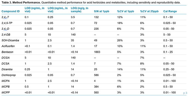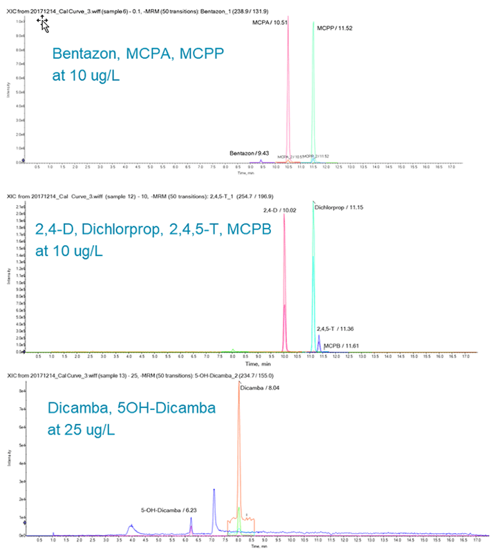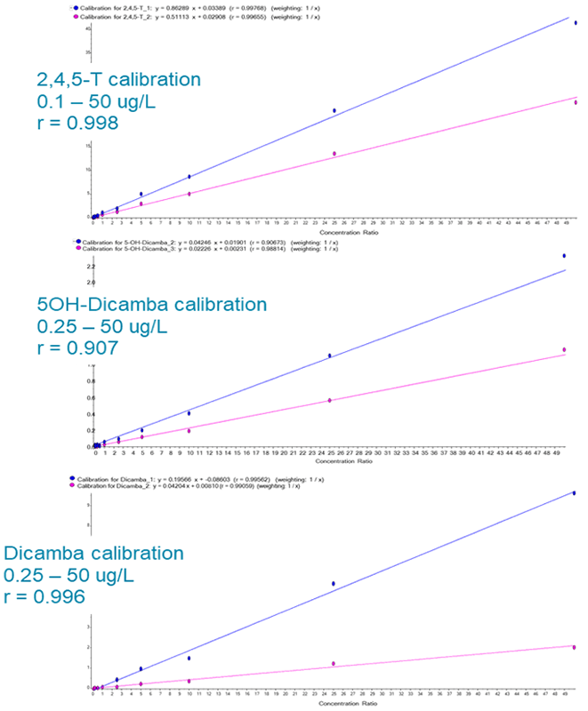 Quantitation: Acid herbicide LODs (Limits of Detection) were found to be mostly <1 ng/mL, with some exceptions including 5OH-dicamba, which had an LOD of 1 ng/mL. Isotopically labelled d3-Dicamba was utilized as an internal standard for all analytes. The calibration range was 0.025 - 50 µg/L (Figure 4).
