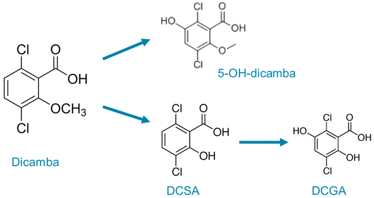 - Important dicamba metabolites 5OH-Dicamba, DCSA, and DCGA were included in the analytical method (Figure 2).