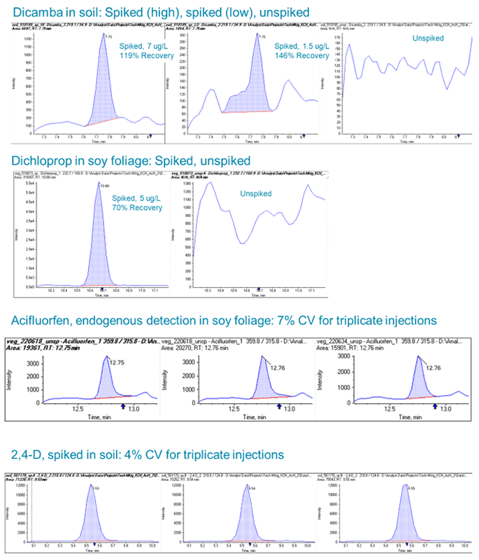 Widespread global use as weed control agents and plant growth regulators for agricultural crops, lawns, and gardens makes the active ingredients in Acid Herbicide (AcH) products account for more use than all the other types of pesticides combined. These predominant herbicide chemicals include the well- characterized 2,4-dichlorophenoxyacetic acid (2,4-D), dicamba, triclopyr, and other AcHs. The US EPA recently ruled in favor of continued use of dicamba despite complaints and concern about drift across plots during spray application. While adjustments in regulation around application patterns were made, these ACHs remain a prevalent concern in environmental monitoring and crop contamination analysis.