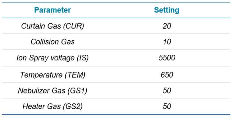 MS conditions: A SCIEX QTRAP® 6500+ System was employed for its sensitivity and robustness. Optimized MRM transitions were selected and utilized for maximum sensitivity. Isotopically labelled target analytes were utilized as internal standards for achieving the highest quality quantitation data in complex soil and plant extracts. Table 1 details the instrument conditions utilized in this method.