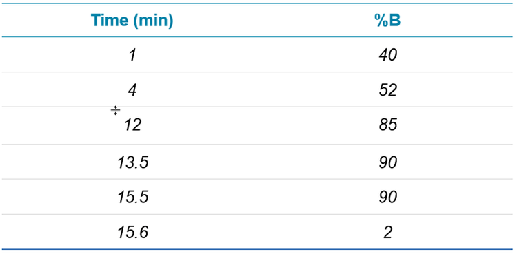 HPLC conditions: Chromatographic separation of these highly polar, low molecular species was achieved using a Phenomenex Kinetex F5 column. Excellent analyte retention and peak quality is demonstrated using this relatively novel stationary phase, and a 17-minute gradient program (Table 2) provided chromatographic resolution for performance in complex extract matrices.