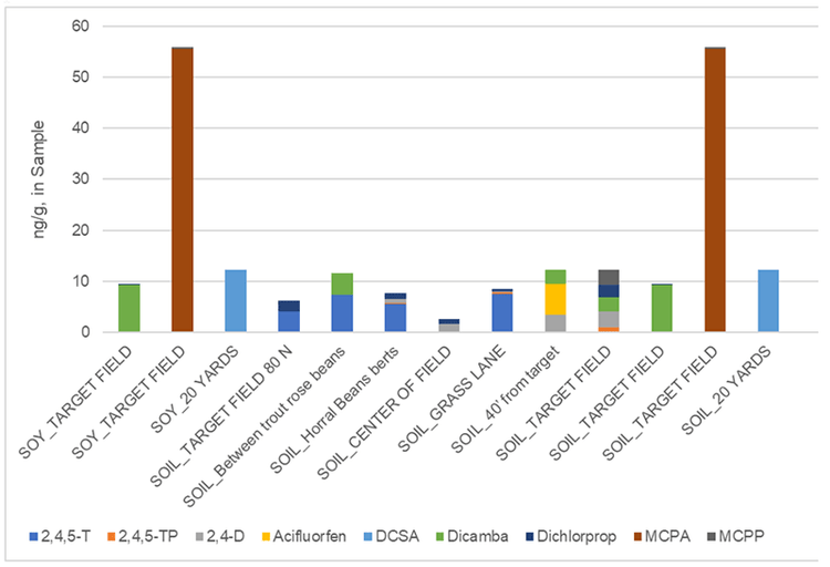2,4,5-T and Dichloprop were detected most frequently; 2,4-D was detected in most vegetation samples but not in any soil samples. MCPA showed high concentration detected in one of each type of sample. Samples were collected not only from targeted fields, but also from increasing distances from the field center. One finding of note was the presence of the metabolite DCSA in samples 20 yards from the center, but not at the center (Figure 1).